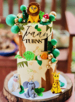 Our jungle-themed cake brings the wild to life with 3D edible animals, fondant leaves, and earthy tones of green and brown. Includes a customizable gold acrylic topper—perfect for adventurous celebrations!