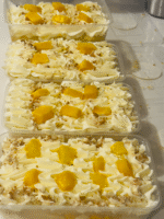 A tropical dessert featuring vanilla infused with juicy mango and topped with a rich freshcream frosting, all beautifully presented in a handy tub container for easy serving and enjoyment.