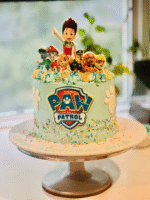 A Paw Patrol-themed cake featuring edible characters, the signature logo, and paw prints, topped with buttercream and piping—a paw-sitive delight for kids!