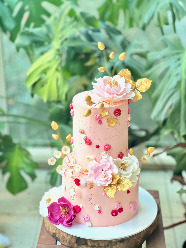 A stunning pink wedding cake adorned with delicate edible sugar flowers, creating an elegant and romantic centerpiece. The cake features smooth pastel pink buttercream layers, accented with intricate floral designs made from gumpaste. Everything on this cake is edible.All theme cakes can be customised, please talk to us if you are looking for something similar but a little different through custom order form.