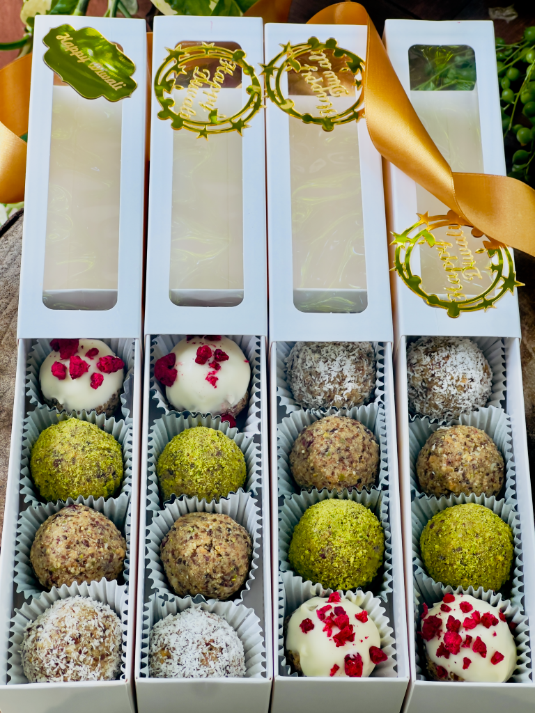 Our Protein Balls are packed with the goodness of seeds, nuts, and dried cranberries. Rich in antioxidants, fiber, Omega-3, vitamins, and minerals, they provide slow-releasing energy to keep you full longer. Sweetened with dates, they also contain Xanthan Gum, which supports collagen production and reduces inflammation. These “POWER PACKED 40GMS BALLS” are a perfect snack for any occasion. Plus, they come with a customizable ribbon and acrylic topper, adding a personalized touch!