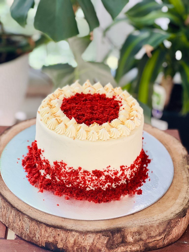The Red Velvet Cake is a stunning dessert that offers a perfect blend of sophistication and indulgence. This cake features a vibrant red sponge that is both moist and tender, providing a delightful contrast to its rich, creamy texture. The unique flavour profile of the Red Velvet Cake is achieved through a subtle hint of cocoa, which enhances its smooth, velvety taste without overpowering its delicate sweetness. Each layer of this elegant cake is generously frosted with a luscious cream cheese icing that complements the cake’s rich flavour. The cream cheese frosting adds a tangy creaminess, creating a harmonious balance that elevates the overall taste experience. The cake is beautifully adorned with a sprinkle of fine crumbs or a decorative touch that adds an extra layer of charm.
