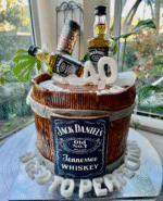 Its time to celebrate!! This fantastic cake comes with Mini JD bottles,fondant edible print,wooden finish made of fondant and ice cubes made from isomalt. Basically everthing is edible. Surely a milestone celebration cake.