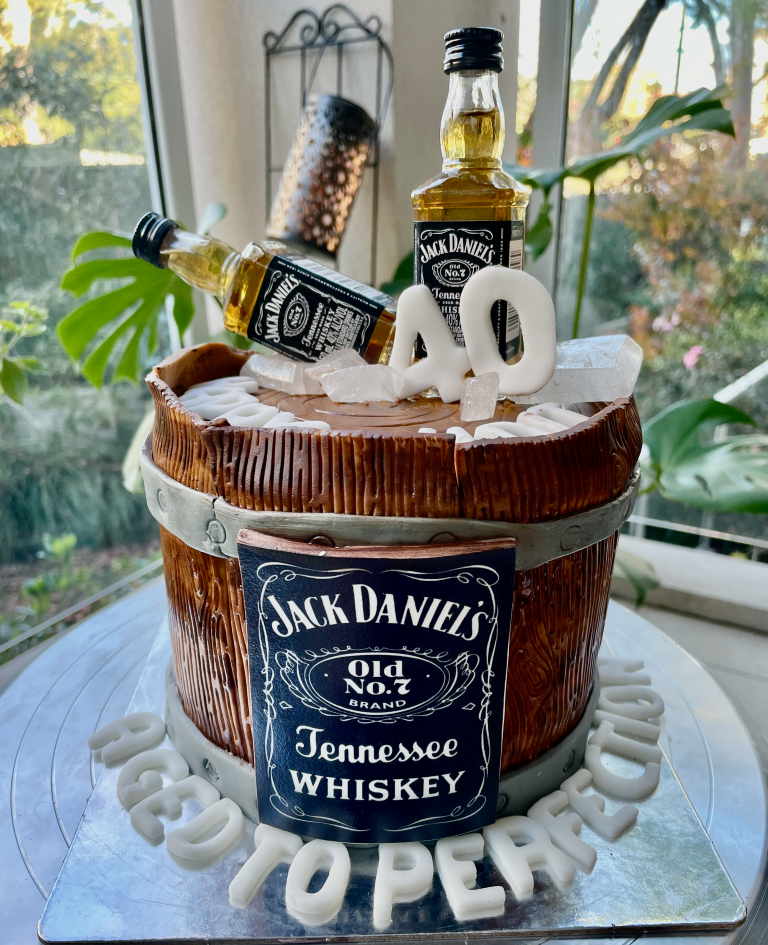 Celebrate with this edible masterpiece! Mini JD bottles, fondant details, and isomalt ice cubes make it perfect for milestones.
